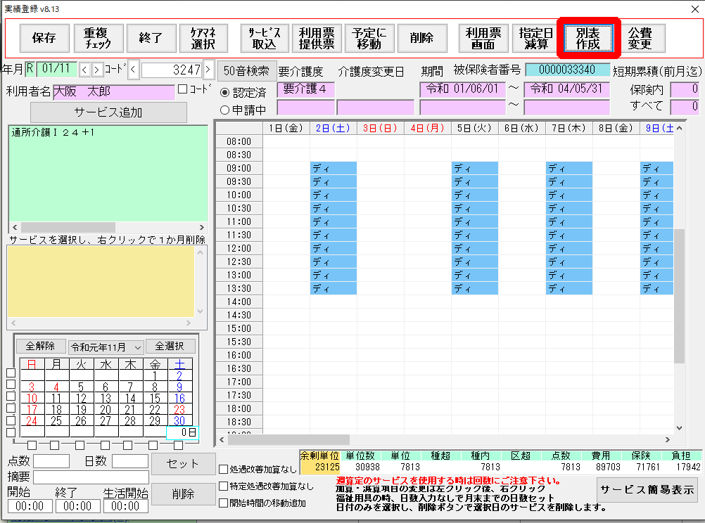 1.予定入力画面で利用者様を選択後、別表作成ボタンをクリックします。