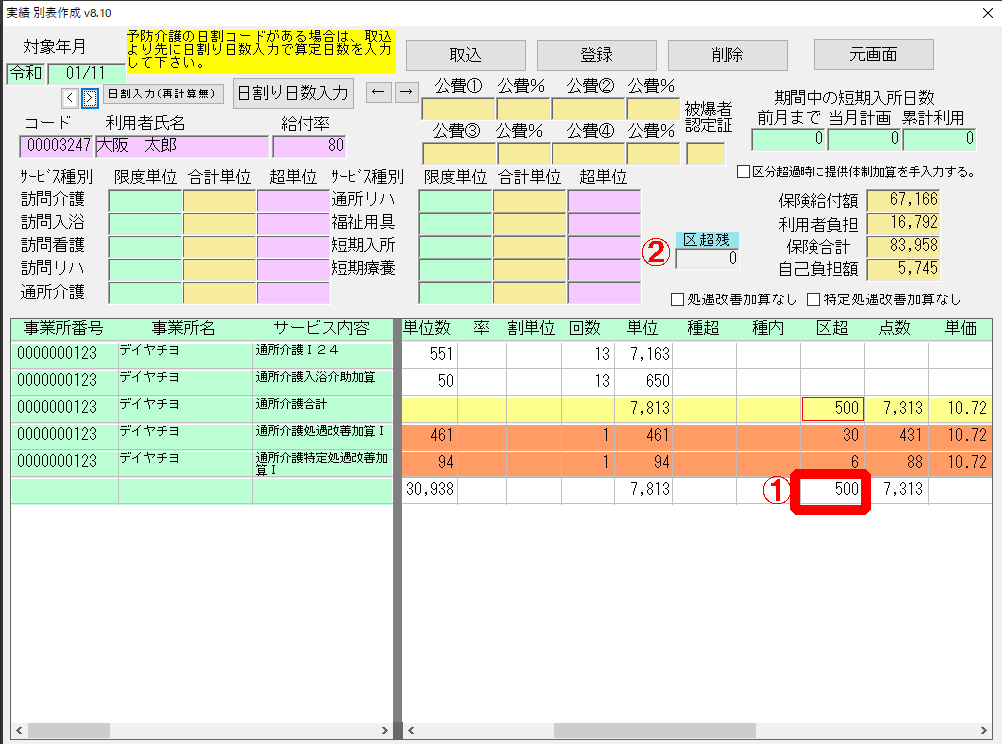 2.ケアマネージャー様より連絡のあった、区分超過の単位数を(この例では500点 )自事業所の黄色の行(合計行)の1の区長欄に入力します。入力後、2の部分に区超残が表示されます。