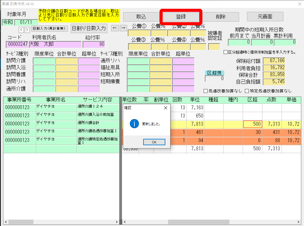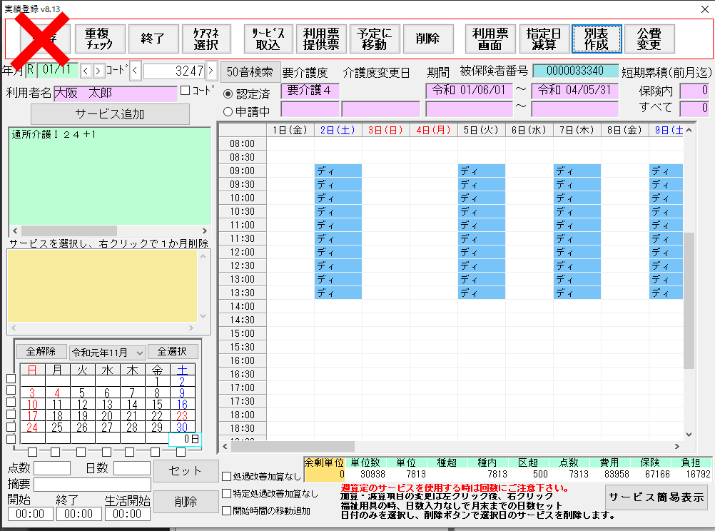 こちらのページでは、ケアマネージャー様より500点の超過が発生したため、デイサービスを行っているサービス事業所(自事業所)に対して自己負担でお願いしますと連絡があった場合の入力を説明いたします。