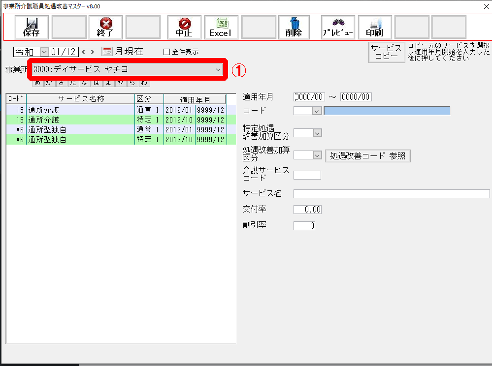 4.処遇改善を算定する開始年月を入力します、終了年月は特に決まっていない場合は9999/12を入力してください。