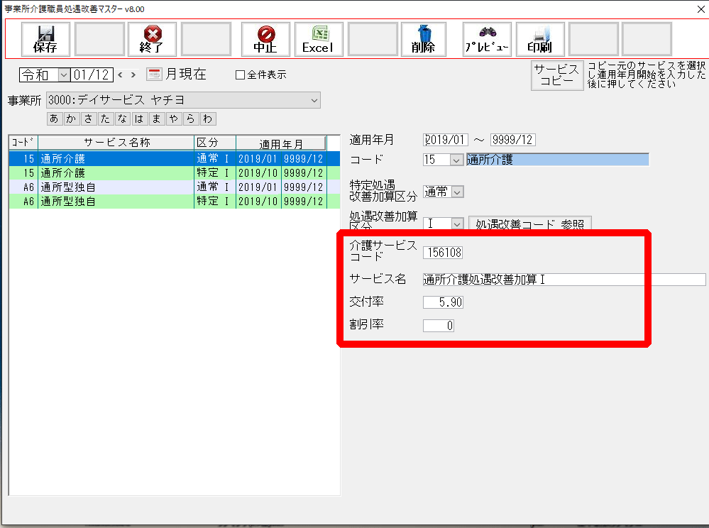 5.上記入力が終わりましたら、右にある処遇改善コード参照ボタンをクリックしますと、介護サービスコード、サービス名、交付率が自動入力されます。